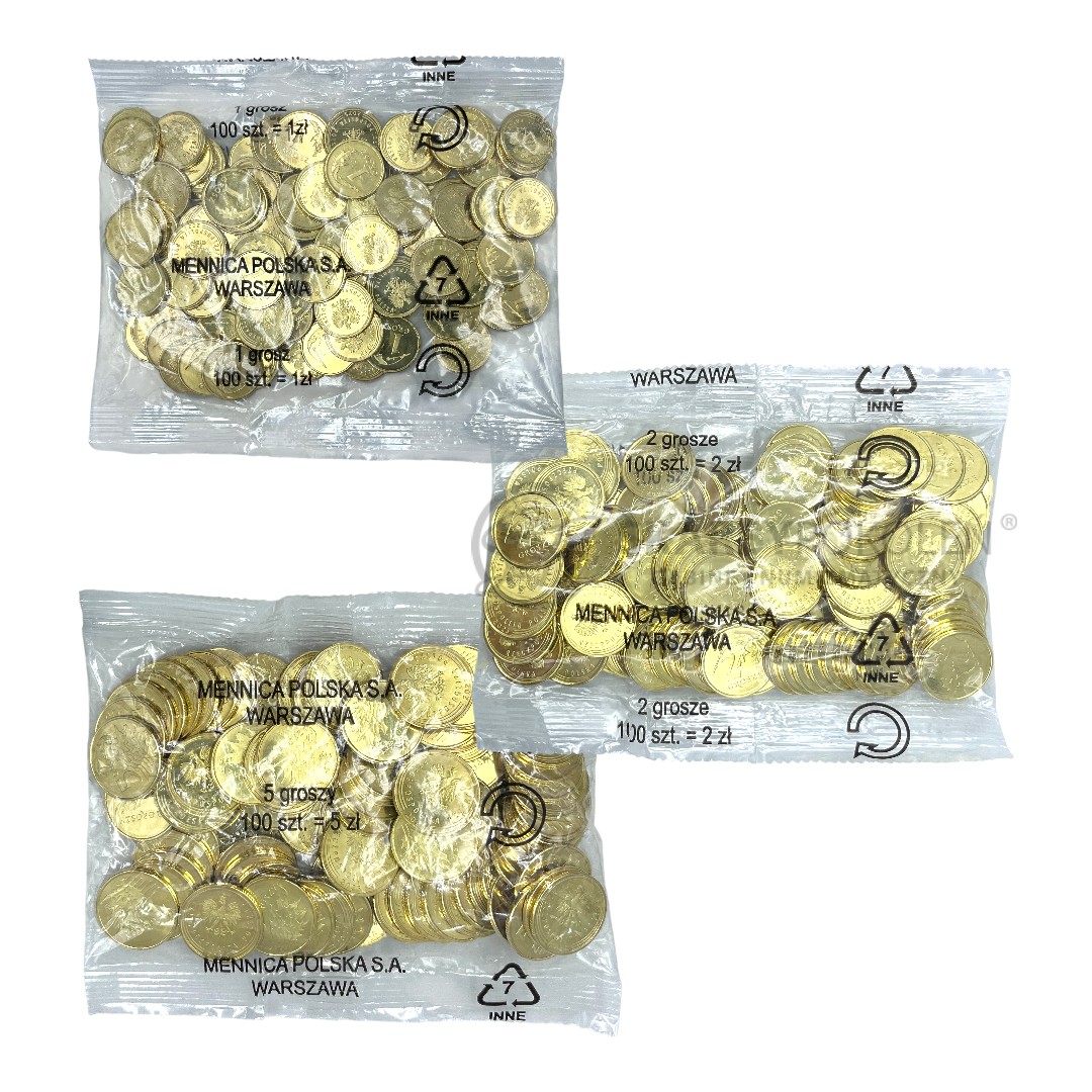 1, 2, 5 groszy 2025 MW – Zestaw 3 woreczków menniczych (łącznie 300 monet)