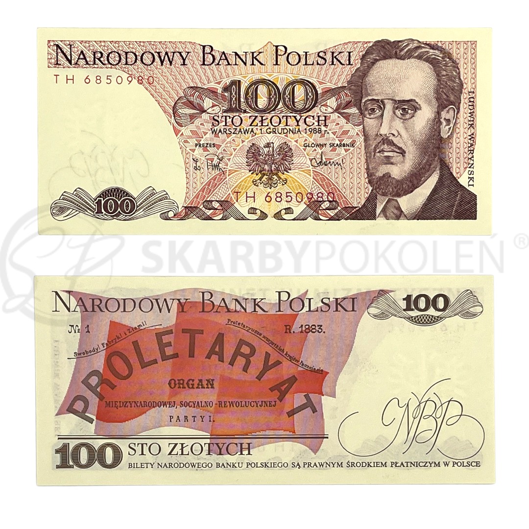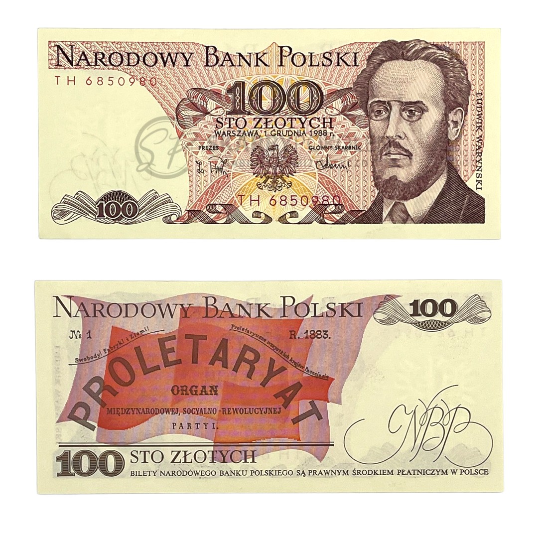 Banknot kolekcjonerski z okresu Polskiej Rzeczypospolitej Ludowej (PRL) o nominale 100 złotych z 1988 roku, przedstawiający Ludwika Waryńskiego, działacza i ideologa robotniczego.