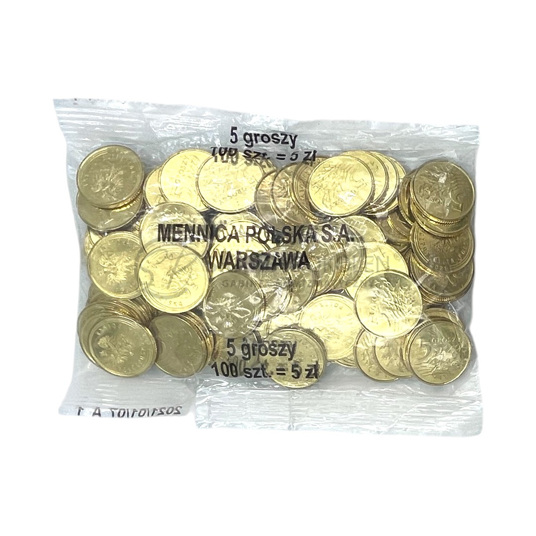 Woreczek menniczy zawierający 100 sztuk monet obiegowych o nominale 5 GROSZY, wybitych w 2021 roku przez Mennicę Polską SA.
