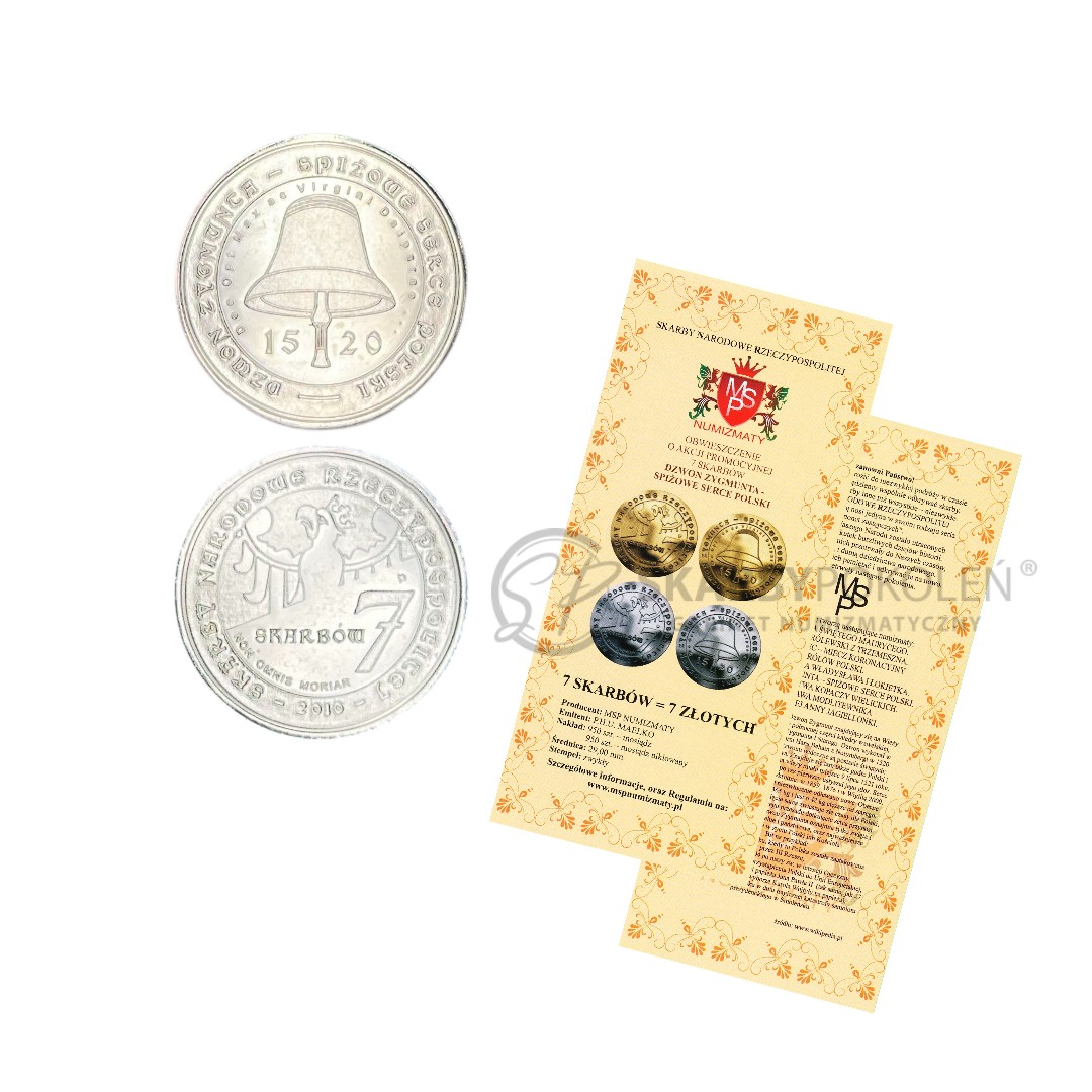 Dukat lokalny o nominale 7 SKARBÓW z serii „Skarby Narodowe Rzeczypospolitej” - „Dzwon Zygmunta - Spiżowe serce Polski”, wybity w 2010 roku.