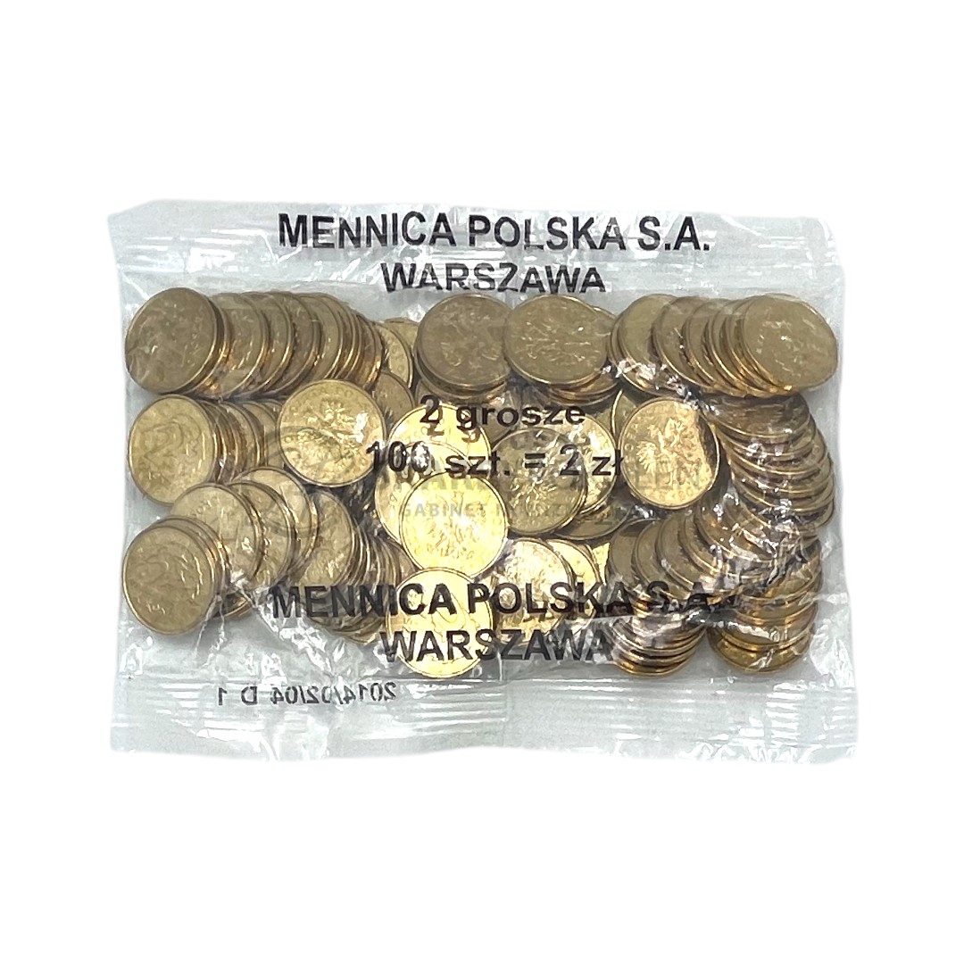 Woreczek menniczy zawierający 100 sztuk monet obiegowych o nominale 2 GROSZE, wybitych w 2014 roku przez Mennicę Polską SA.