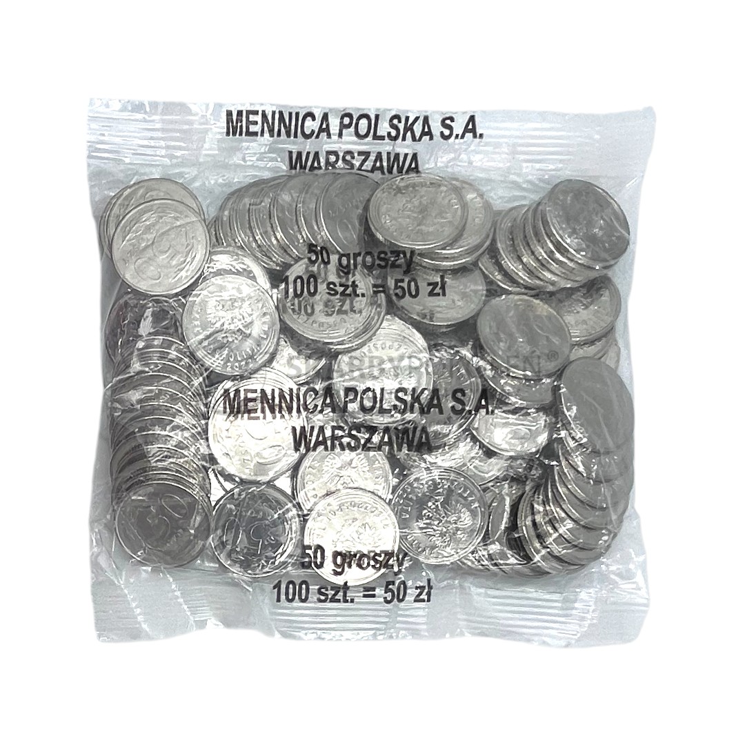 Woreczek menniczy zawierający 100 sztuk monet obiegowych o nominale 50 GROSZY, wybitych w 2022 roku przez Mennicę Polską SA.