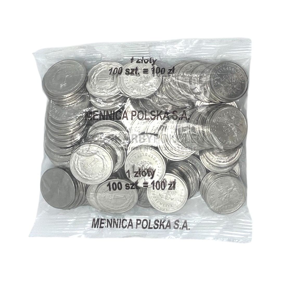 Woreczek menniczy zawierający 100 sztuk monet obiegowych o nominale 1 ZŁOTY, wybitych w 2021 roku przez Mennicę Polską SA.