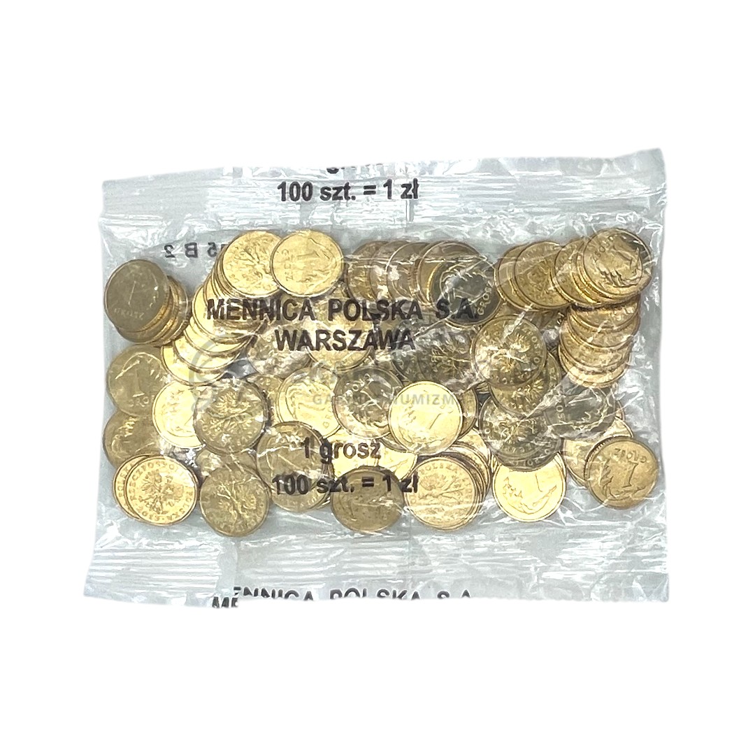 Woreczek menniczy zawierający 100 sztuk monet obiegowych o nominale 1 GROSZ, wybitych w 2013 roku przez Mennicę Polską SA.
