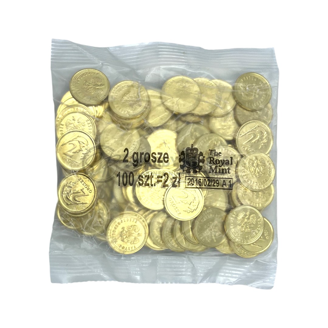 Woreczek menniczy zawierający 100 sztuk monet obiegowych o nominale 2 GROSZE, wybitych w 2016 roku przez mennicę The Royal Mint.