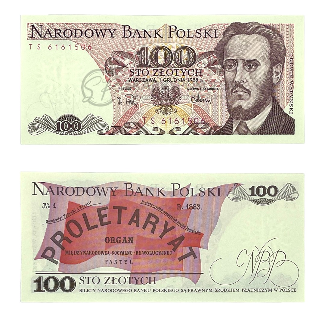 Banknot kolekcjonerski z okresu Polskiej Rzeczypospolitej Ludowej (PRL) o nominale 100 złotych z 1988 roku, przedstawiający Ludwika Waryńskiego, działacza i ideologa robotniczego.