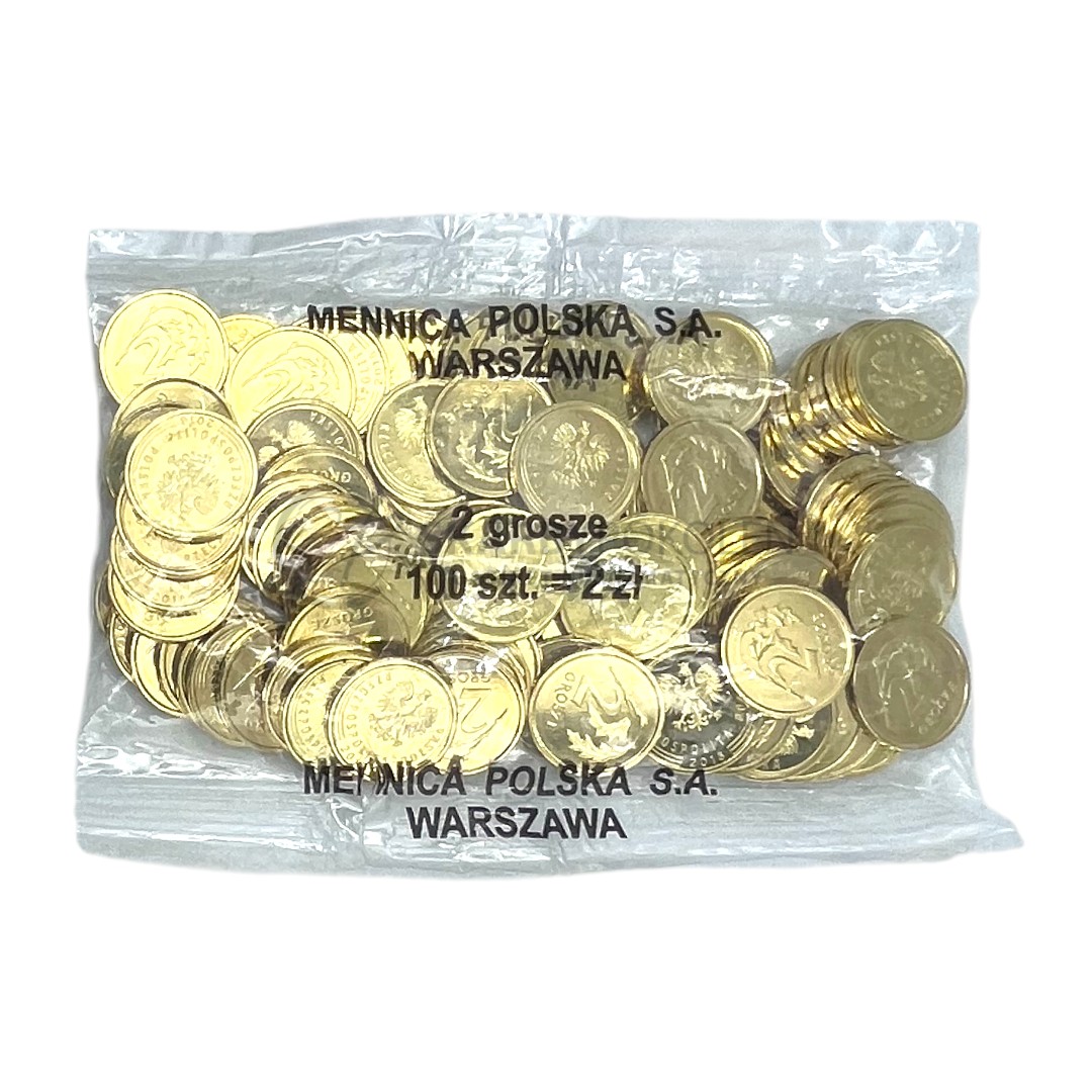 Woreczek menniczy zawierający 100 sztuk monet obiegowych o nominale 2 GROSZE, wybitych w 2018 roku przez Mennicę Polską SA.