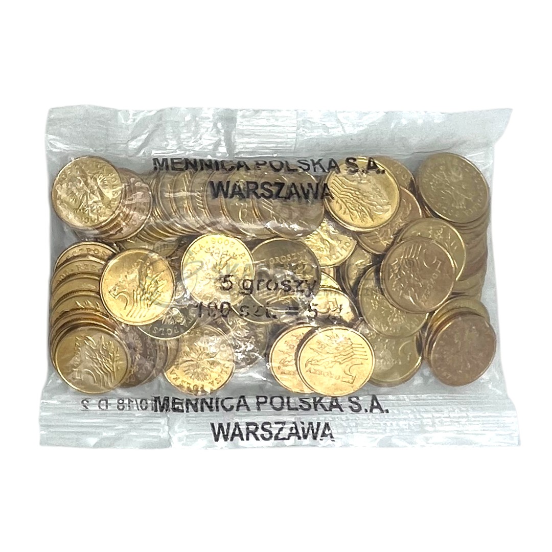 Woreczek menniczy zawierający 100 sztuk monet obiegowych o nominale 5 GROSZY, wybitych w 2006 roku przez Mennicę Polską SA.