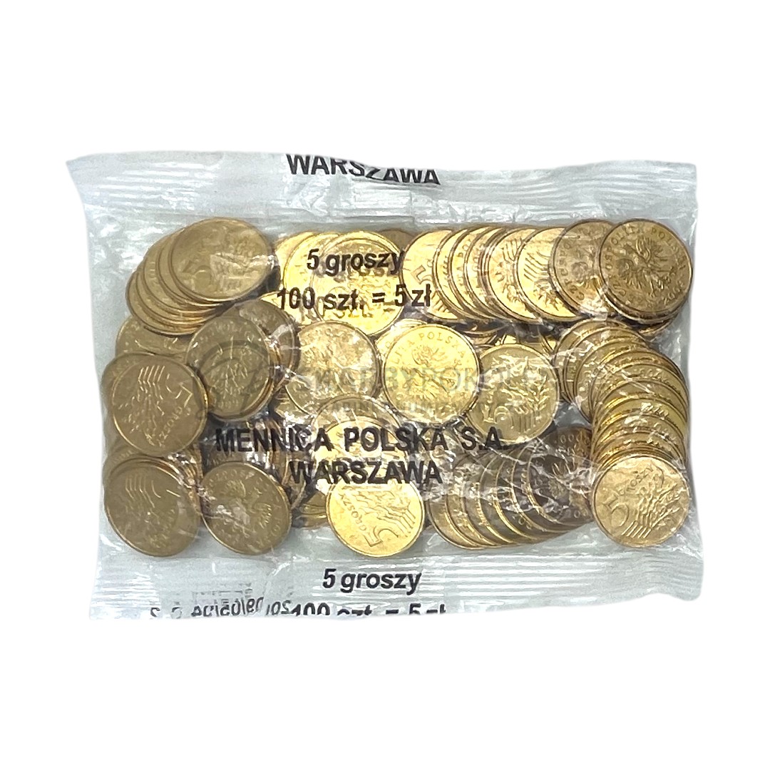 Woreczek menniczy zawierający 100 sztuk monet obiegowych o nominale 5 GROSZY, wybitych w 2009 roku przez Mennicę Polską SA.