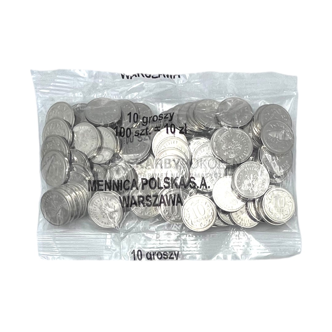 Woreczek menniczy zawierający 100 sztuk monet obiegowych o nominale 10 GROSZY, wybitych w 2021 roku przez Mennicę Polską SA.