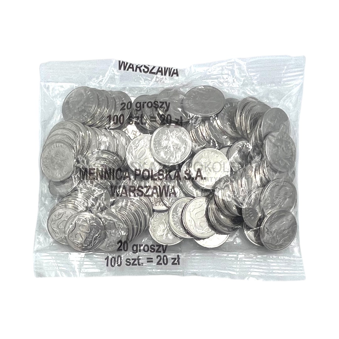 Woreczek menniczy zawierający 100 sztuk monet obiegowych o nominale 20 GROSZY, wybitych w 2021 roku przez Mennicę Polską SA.