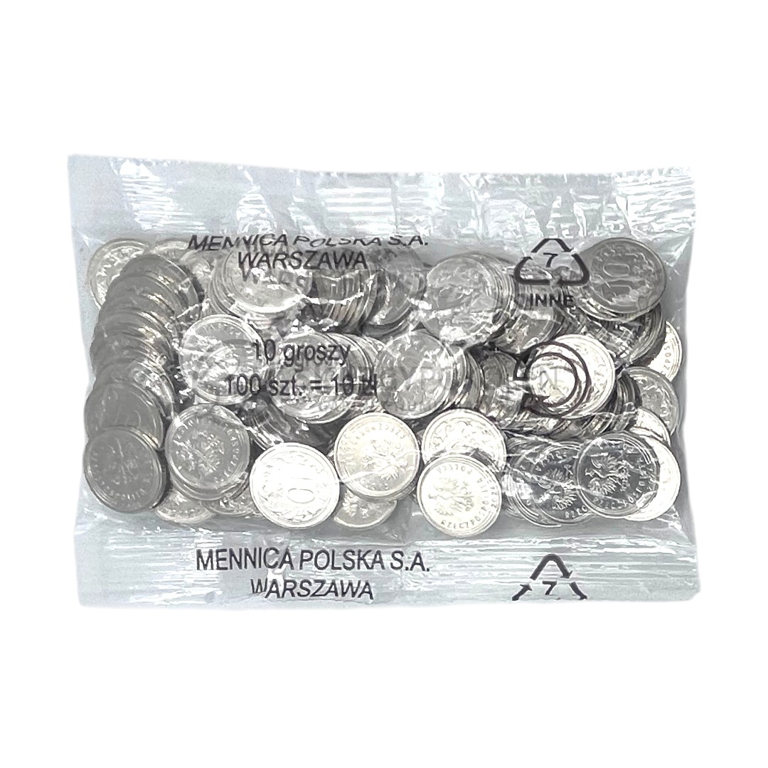 Woreczek menniczy zawierający 100 sztuk monet obiegowych o nominale 10 GROSZY, wybitych w 2024 roku przez Mennicę Polską SA.