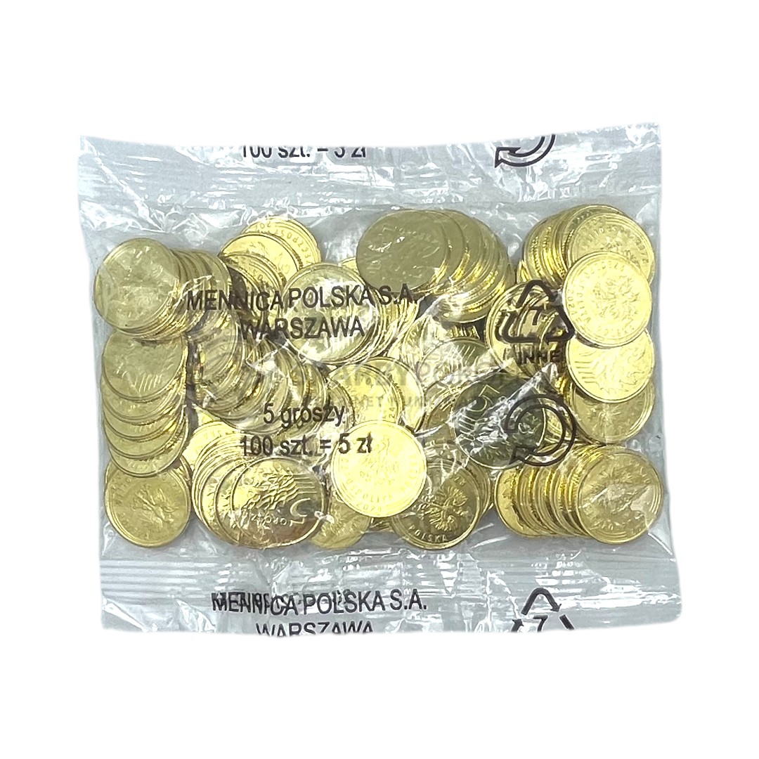 Woreczek menniczy zawierający 100 sztuk monet obiegowych o nominale 5 GROSZY, wybitych w 2024 roku przez Mennicę Polską SA.