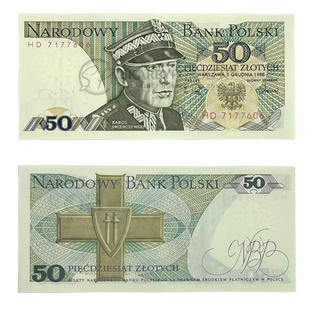 Banknot kolekcjonerski z okresu Polskiej Rzeczypospolitej Ludowej (PRL) o nominale 50 złotych z 1988 roku, przedstawiający Karola Świerczewskiego, generała Wojska Polskiego i Armii Czerwonej.