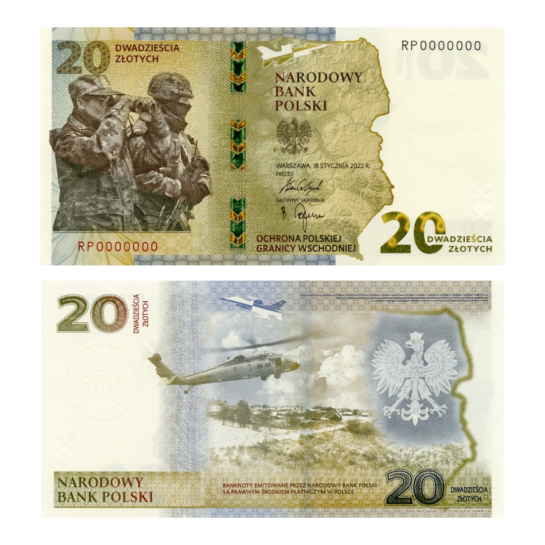 Banknot kolekcjonerski o nominale 20 zł, wyemitowany w 2022 roku przez PWPW SA, upamiętniający Ochrona polskiej granicy wschodniej.