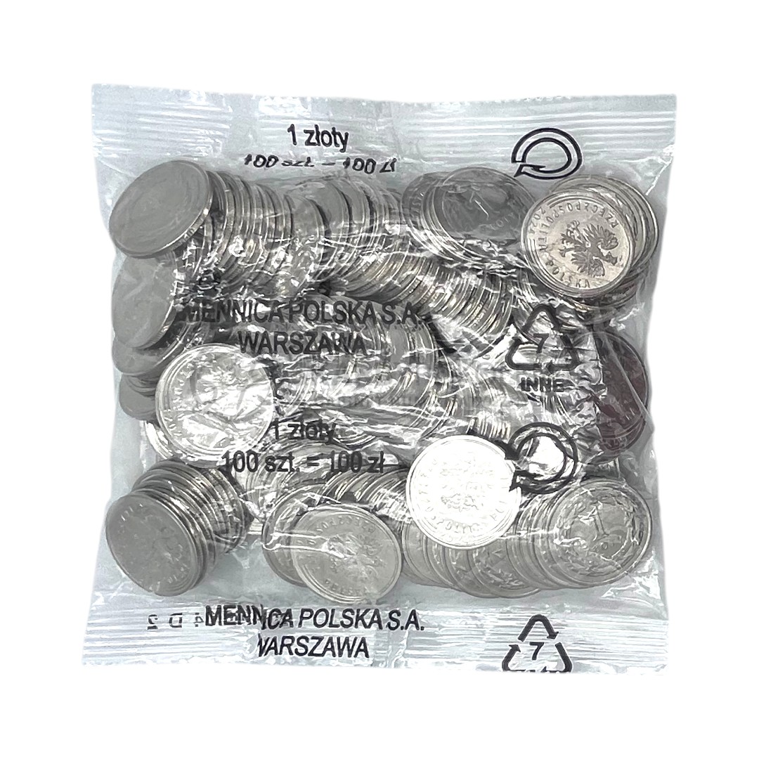 Woreczek menniczy zawierający 100 sztuk monet obiegowych o nominale 1 ZŁOTY, wybitych w 2024 roku przez Mennicę Polską SA.