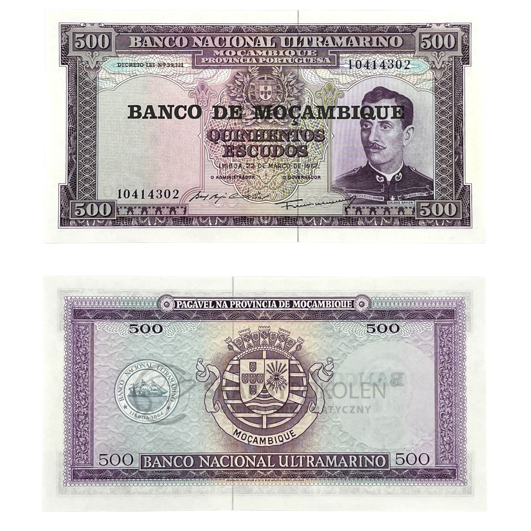 Banknot zagraniczny pochodzący z kraju Mozambik, o nominale 500 Escudos.